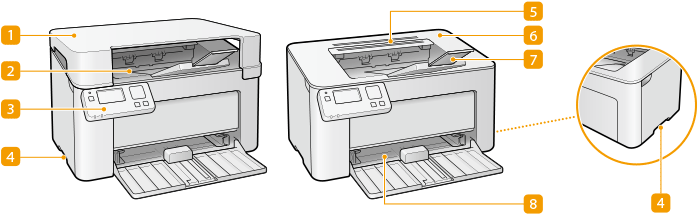 ]-näppäin,Takaisin-painike, näyttö ja tilan merkkivalot. Voit suorittaa kaikki toimenpiteet ja määrittää asetukset käyttöpaneelista.