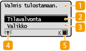 <Tilavalvonta>Valitse tämä painike, kun haluat tarkistaa tulostuksen tilan, näyttää käyttöhistorian tai näyttää verkkoasetukset, kuten laitteen IP-osoitteen. Voit myös tarkistaa laitteen tilan, kuten väriainekaseteissa jäljellä olevat määrät jne. tai mahdollisesti tapahtuneet virheet.