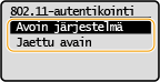 Kun yhdistetään langattomaan lähiverkkoon, laitteessa tapahtuu todennusvirhe, jos langattomassa reitittimessä on asetettu jaettu avaintodennus. Jos näin tapahtuu, laite vaihtaa automaattisesti asetukseksi <Jaettu avain> ja yrittää muodostaa yhteyden uudelleen.