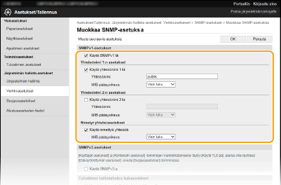 SNMP (Simple Network Management Protocol) on protokolla, jolla valvotaan ja ohjataan verkon tiedonsiirtolaitteita käyttämällä MIB:tä (Management Information Base). Laite tukee SNMPv1-protokollaa ja edistyneemmän suojauksen SNMPv3-protokollaa. Voit tarkistaa laitteen tilan tietokoneesta, kun tulostat asiakirjoja tai käytät Etäkäyttöliittymää. Voit ottaa käyttöön SNMPv1:n, SNMPv3:n tai molemmat samanaikaisesti. Määritä kunkin version asetukset verkkoympäristöön ja käyttötarkoitukseen sopiviksi.
