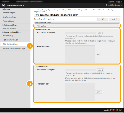 Hvis IP-adresser blir angitt feil, kan det hende at du ikke får tilgang til maskinen fra Fjernkontroll. I så fall må du angi <IPv4-adressefilter> eller <IPv6-adressefilter> til <Av>. <IPv4-adressefilter> <IPv6-adressefilter>