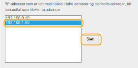Tillater kommunikasjon (mottatt) bare med enheter der IP-adressene er registrert i [Tillatte adresser], og begrenser kommunikasjon med enheter med alle andre IP-adresser. Kommunikasjon er imidlertid begrenset for IP-adresser som også er registrert i [Blokkerte adresser].