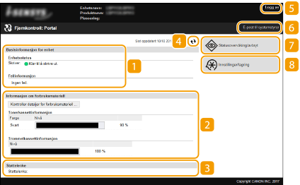 Når du logger inn på Fjernkontroll, vises følgende Portalside. Denne delen beskriver elementene som vises på Portalsiden og de grunnleggende handlingene.