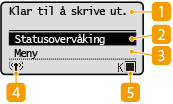 <Statusovervåking>Velg for å kontrollere statusen for utskrift, for å vise forbrukshistorikken eller for å vise nettverksinnstillingene, for eksempel maskinens IP-adresse. Du kan også kontrollere statusen til maskinen, som gjenværende mengde toner i tonerkassetten eller hvorvidt eventuelle feil har oppstått.