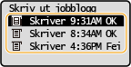 Velg det dokumentet du vil kontrollere loggen for.<OK> viser når et dokument er skrevet ut, og <Feil> vises når utskriften mislyktes fordi den ble avbrutt eller det oppstod en feil.