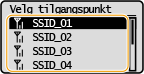 Du kan søke etter trådløse rutere (eller tilgangspunkt) som er tilgjengelige for tilkobling, og velge en fra skjermen på maskinen. Tast inn en WEP-nøkkel eller PSK for nettverksnøkkelen. Før du velger en trådløs ruter, må du kontrollere og skrive ned den nødvendige konfigurasjonsinformasjonen, inkludert SSID-en og nettverksnøkkelen (