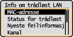 <Status for trådløst LAN> og <Nyeste feilinformasjon> kan vises fra <Statusovervåking>.