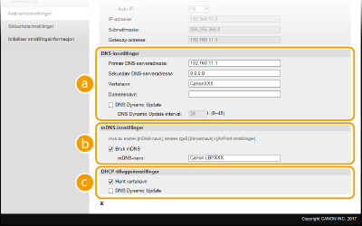 mDNS (multikast-DNS) brukes av Bonjour og er en protokoll for å knytte et vertsnavn til en IP-adresse uten bruk av DNS. Merk av i boksen hvis du vil aktivere mDNS, og angi mDNS-navnet i tekstboksen [mDNS-navn]. [DHCP-tilleggsinnstillinger][Hent vertsnavn]