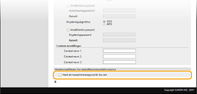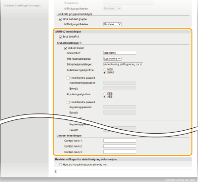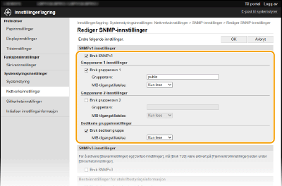 Hvis begge versjoner av SNMP er aktivert, anbefales det at MIB-tilgangstillatelsen i SNMPv1 angis til [Kun lese]. MIB-tilgangstillatelsen kan angis uavhengig i SNMPv1 og SNMPv3 (og for hver bruker i SNMPv3). Ved å velge [Lese/skrive] (full tilgangstillatelse) i SNMPv1 oppheves de robuste sikkerhetsfunksjonene som er et kjennetegn i SNMPv3, fordi de fleste av maskininnstillingene dermed kan kontrolleres med SNMPv1.