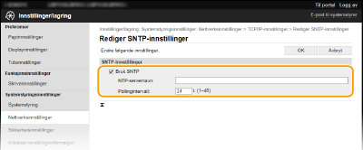 Merk av for [Bruk SNTP], og angi de nødvendige innstillingene.