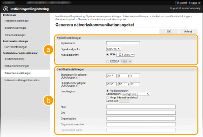 Välj nyckelgenereringsalgoritmen i [RSA] eller [ECDSA], och välj sedan nyckellängd i listrutan. Ju större tal för nyckellängden desto högre säkerhetsnivå. Dock blir kommunikationen långsammare.