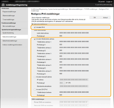 Enhetens IPv6-adresser kan konfigureras via gränssnittet för fjärranvändning. Innan du anger IPv6-adresser ska du kontrollera inställningarna för IPv4-adressen (Visa IPv4-inställningar). Du måste ange rätt IPv4-inställningar för att kunna använda IPv6-adresser. Enheten kan använda följande IPv6-adresser: