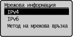 Показва мрежовите настройки, като напр. IP адреса на устройството, и състоянието, като напр. условията за безжична LAN комуникация.