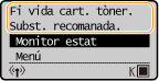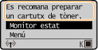 Aquest missatge us informa que el cartutx de tòner ha arribat a la fi de la seva vida útil. Es recomana que substituïu el cartutx de tòner per un de nou. Podeu continuar imprimint, però no es pot garantir que la qualitat d'impressió sigui bona.