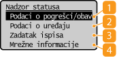 Ako odaberete <Nadzor statusa>, prikazat će se zaslon na kojem možete provjeriti tijek obrade dokumenta te status uređaja (preostalu razinu tonera u spremnicima itd.) i mrežne postavke kao što je IP adresa uređaja.