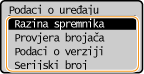 Prikazuje status uređaja, kao što je preostala količina tonera u spremnicima i sl.