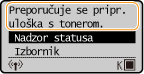 Kada razina tonera u spremniku bude niska, na uređaju će se prikazati poruka. Kvaliteta ispisa možda bude lošija ako nastavite s ispisom bez ikakve intervencije. Količinu preostalog tonera u spremnicima možete provjeriti na zaslonu (