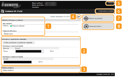 Když se přihlásíte do Vzdáleného uživatelského rozhraní, objeví se následující stránka portálu. V této části jsou popsány položky zobrazené na stránce portálu a základní operace.