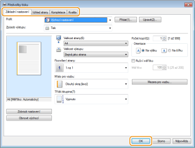 Vyberete ovladač tiskárny pro daný stroj a klikněte na tlačítko [Předvolby] nebo [Vlastnosti].