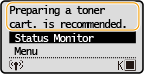 هنگامی که مقدار باقیمانده کارتریج تونر کاهش می یابد، دستگاه یک پیام نمایش می دهد. توجه داشته باشید اگر به چاپ ادامه دهید بدون اینکه این مشکل را حل کرده باشید ممکن است کیفیت چاپ تحت تأثیر قرار بگیرد. می توانید مقدار باقیمانده کارتریج تونر را در نمایشگر بررسی کنید (