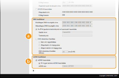 Ha bejelöli a jelölőnégyzetet, akkor a készülék dinamikusan frissíti a DNS-rekordokat, amikor megváltozik az IP-címe. A [Kézi cím regisztrálása], [Állapottartó cím bejegyzése] és [Állapot nélküli cím bejegyzése] jelölőnégyzetek közül a megfelelők bejelölésével adja meg a DNS-kiszolgálón bejegyezni kívánt címtípusokat. A frissítések időközének megadásához írjon be egy időtartamot órákban a [DNS dinamikus frissítési időköze] szövegmezőbe. [mDNS beállításai][mDNS használata]