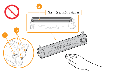 ), elektros kontaktų ( ) arba dažomųjų miltelių kasetės atminties ( ).![]() Dažomųjų miltelių kasetę išimkite iš pakavimo medžiagos arba iš aparato tik tuomet, kai tai būtina.