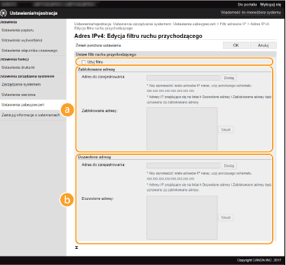 Nieprawidłowo wprowadzone adresy IP mogą uniemożliwić dostęp do urządzenia z poziomu Zdalnego interfejsu użytkownika. Konieczne będzie wtedy ustawienie filtra <Filtr adresów IPv4> albo <Filtr adresów IPv6> na <Wyłącz>. <Filtr adresów IPv4><Filtr adresów IPv6>
