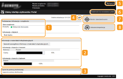 Wyświetla bieżący stan urządzenia i informacje o błędach. W przypadku wystąpienia błędu wyświetlana jest strona Informacje o błędzie.