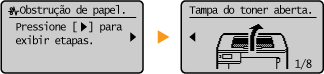 Em alguns casos, quando ocorre um erro, aparecem instruções para lidar com o erro. Siga as instruções no ecrã para resolver o problema. O ecrã apresentado quando ocorre um encravamento de papel é mostrado abaixo como exemplo.