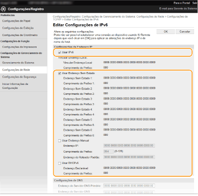 Os endereços IPv6 da máquina podem ser configurados através da UI Remota. Antes de definir endereços IPv6, verifique as definições de endereço IPv4 (Ver as definições de IPv4). É necessário configurar as definições corretas de IPv4 para poder utilizar endereços IPv6. A máquina pode utilizar os seguintes endereços IPv6: