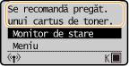 Acest mesaj vă anunţă că un cartuş de toner trebuie înlocuit în curând. Asiguraţi-vă că aveţi pregătit un cartuş de toner pentru înlocuire. Înlocuiţi cartuşul toner dacă vedeţi acest mesaj înainte de a începe să imprimaţi o lucrare mare.