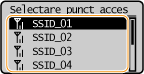 Puteţi să căutaţi routerele wireless (sau punctele de acces) disponibile pentru conectare şi să selectaţi unul de pe afişajul aparatului. Pentru cheia de reţea, introduceţi o cheie WEP sau PSK. Înainte de a selecta un router wireless, verificaţi şi notaţi informaţiile de configurare necesare, inclusiv SSID-ul şi cheia de reţea (Verificarea SSID-ului şi a cheii de reţea).