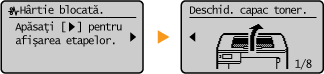 Specificarea formatului şi a tipului de hârtie în sertar Imprimarea de la un computer Nu forţaţi scoaterea hârtiei blocate din aparatDacă forţaţi scoaterea hârtiei puteţi deteriora componentele. Dacă nu puteţi scoate hârtia, contactaţi distribuitorul local autorizat Canon sau linia telefonică de asistenţă Canon. Când o problemă nu poate fi rezolvată