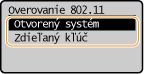 Ak je na bezdrôtovom smerovači nastavené overovanie zdieľaným kľúčom, pri pripájaní k bezdrôtovej sieti LAN dôjde v zariadení k chybe overenia. Ak sa to stane, zariadenie automaticky zmení nastavenie na <Zdieľaný kľúč> a znova sa pokúsi o pripojenie.