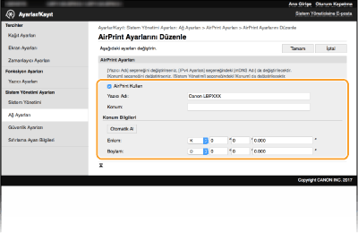 Makinenin adı ve kurulum yeri de dahil olmak üzere, makineyi tanımlamak için kullanılan bilgileri kaydedebilirsiniz. Makinenin AirPrint işlevini devre dışı da bırakabilirsiniz. Bu ayarları değiştirmek için Uzak Kullanıcı Arabirimi'ni kullanın.