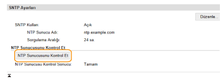 [SNTP Ayarları] bölümünde [Ayarlar/Kayıt]  [Ağ Ayarları]  [TCP/IP Ayarları]  [NTP Sunucusunu Kontrol Et] öğesine tıklayarak kayıtlı sunucudaki iletişim durumunu görüntüleyebilirsiniz. Uygun bir bağlantı kurulduysa, aşağıda gösterildiği gibi sonuç görüntülenir. Bu işlemin, sistem saatini ayarlamadığını unutmayın.