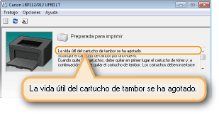 Podrá desactivar la presentación del mensaje [Se debe sustituir el cartucho de tambor a la brevedad.] haciendo lo siguiente: seleccione el menú [Opciones] de la Ventana de estado de impresora  [Opciones de dispositivos]  Quite la marca de la casilla de verificación [Mostrar aviso de sustitución de cartucho] en el cuadro de diálogo [Opciones de presentación de advertencias].