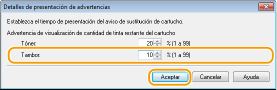 En [Tambor] dentro de [Advertencia de visualización de cantidad de tinta restante del cartucho], especifique la cantidad restante en el cartucho de tambor para que se muestre el mensaje y, a continuación, haga clic en [Aceptar].