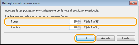 In [Toner] sotto [Quantità residua nella cartuccia per visualizzare l'avviso], specificare la quantità di toner rimanente nella cartuccia al raggiungimento della quale deve essere visualizzato il messaggio, quindi fare clic su [OK].
