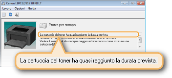 È possibile disattivare la visualizzazione del messaggio [La cartuccia del toner deve essere sostituita a breve.] con la procedura seguente: selezionare il menu [Opzioni] della Finestra stato stampante  [Impostazioni periferica]  Deselezionare la casella di controllo [Visualizza nota di sostituzione cartuccia] nella finestra di dialogo [Impostazioni visualizzazione avvisi].