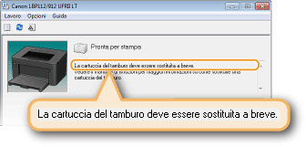 È possibile disattivare la visualizzazione del messaggio [La cartuccia del tamburo deve essere sostituita a breve.] con la procedura seguente: selezionare il menu [Opzioni] della Finestra stato stampante  [Impostazioni periferica]  Deselezionare la casella di controllo [Visualizza nota di sostituzione cartuccia] nella finestra di dialogo [Impostazioni visualizzazione avvisi].