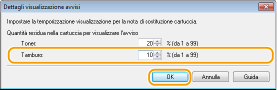 In [Tamburo] sotto [Quantità residua nella cartuccia per visualizzare l'avviso], specificare la quantità rimanente nella cartuccia tamburo al raggiungimento della quale deve essere visualizzato il messaggio, quindi fare clic su [OK].