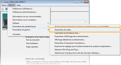 Le mode veille permet de réduire la consommation électrique de l'appareil par l'arrêt temporaire de certaines opérations internes. Vous pouvez régler l'appareil pour qu'il passe automatiquement en mode veille en cas d'inactivité pendant un certain temps. Par défaut, ce délai d'inactivité est de 1 minute. Nous vous conseillons d'utiliser ce réglage par défaut pour réduire au maximum la consommation électrique. Si vous souhaitez modifier le délai d'inactivité précédant le passage en mode veille, suivez la procédure suivante dans la Fenêtre du statut de l'imprimante.