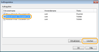 Wählen Sie das Dokument, bei dem das Drucken abgebrochen werden soll, und klicken Sie auf [Löschen].