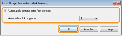 Markér afkrydsningsfeltet for at aktivere automatisk lukning efter den tidsperiode, der er angivet i [Automatisk lukning efter].