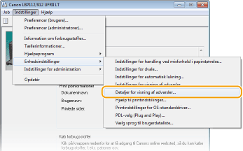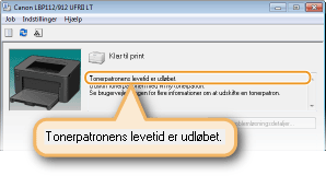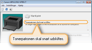 Du kan deaktivere visning af meddelelsen [Tonerpatronen skal snart udskiftes.] ved at gøre følgende: I Vinduet printerstatus skal du vælge menuen [Indstillinger]  [Enhedsindstillinger]  Fjern markeringen i afkrydsningsfeltet [Vis bemærkning om udskiftning af patron] i dialogboksen [Indstillinger for visning af advarsler].