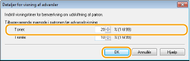 I [Toner] under [Tilbageværende mængde i patronen før advarselsvisning] skal du angive den tilbageværende mængde i tonerpatronen for at få vist meddelelsen og derefter klikke på [OK].