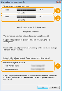 Den viste mængde resterende toner i tonerpatronen eller tromlepatronen er kun vejledende og kan være anderledes end den faktiske mængde.