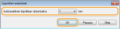 Lepotilatoiminto vähentää laitteen kuluttaman virran määrää pysäyttämällä tilapäisesti eräitä sisäisiä toimintoja. Voit asettaa laitteen siirtymään lepotilaan automaattisesti, kun se on ollut käyttämättömänä tietyn ajan. Tehtaan oletusaika ennen lepotilaan siirtymistä on 1 minuutti. Oletusajan käyttöä suositellaan parasta virransäästöä varten. Jos haluat muuttaa lepotilaan siirtymisaikaa, noudata tulostimen tilaikkunassa alla olevia ohjeita.