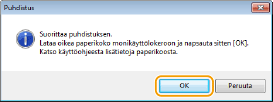 Laitteen sisällä olevaan kiinnityskokoonpanoon saattaa tarttua likaa, joka aiheuttaa tulosteisiin mustia raitoja. Puhdista kiinnityskokoonpano tekemällä seuraavat toimet. Huomaa, että kiinnityskokoonpanoa ei voi puhdistaa, kun laitteessa on tulostamista odottavia asiakirjoja. Kiinnityskokoonpanon puhdistamiseen tarvitaan tavallista A4-kokoista paperia. Aseta paperi paperikasettiin ennen seuraavien toimien tekemistä.